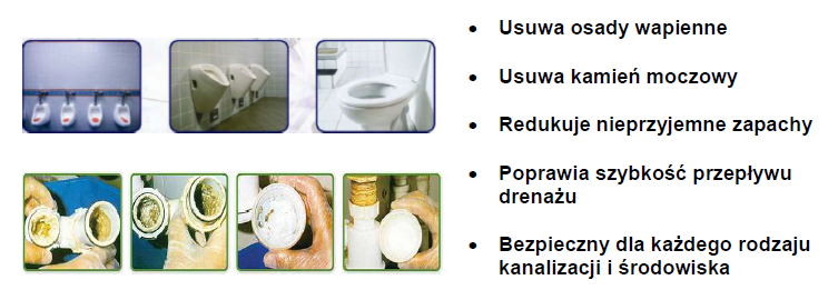 Szybko i skutecznie usuwa: osady wapienne i kamień moczowy oraz pozostałości organiczne.
