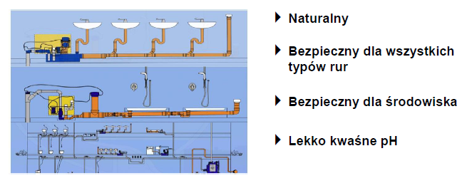 Bezpieczne kwasy organiczne rozpuszczają depozyty mineralne, w wyniku czego poprawia się przepustowość przewodów kanalizacyjnych.