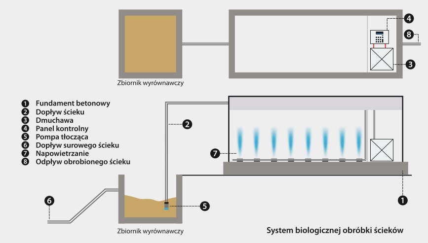 W kontenerowej skompaktowanej oczyszczalni ścieków procesy osadu czynnego działają według zasady ciągłego nieprzerwanego dopływu i sekwencyjnego odpływu, procesy napowietrzania i wytrącania przeprowadzane są w tym samym zbiorniku poprzez okresowe przerywanie procesu napowietrzania.